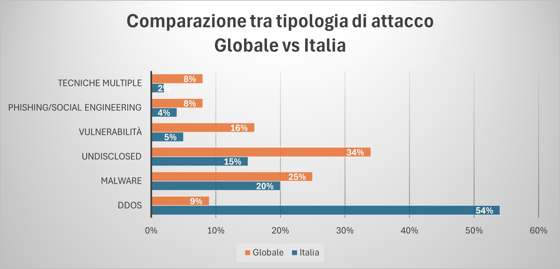 In Italia il numero di attacchi di tipo DDoS è cinque volte più alto di quelli riscontrati nel resto del mondo. Gli attacchi di tipo DDoS, quindi, si riprendono il primo posto in classifica come già avvenuto nel 2023 (inizio della guarra in Ucraina), attestandosi al 54%. Questo tipo di attacchi è tipico dell'hacktivismo, e lo scopo è richiamare l’attenzione sulla loro causa e l’interruzione di servizi può essere un mezzo efficace per rendere evidente al pubblico il proprio messaggio di protesta.